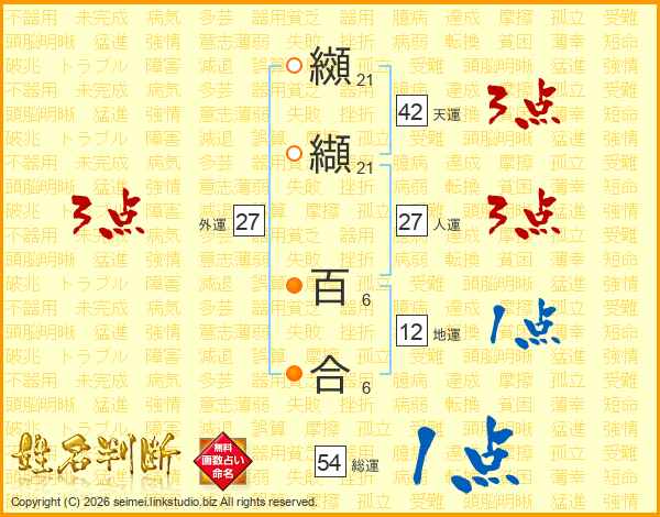 あなたの人生を表す1番重要な運勢です。生涯を通じて影響する総合運となり、主に50歳以降の晩年期に影響を及ぼします。苗字と名前の合計画数。