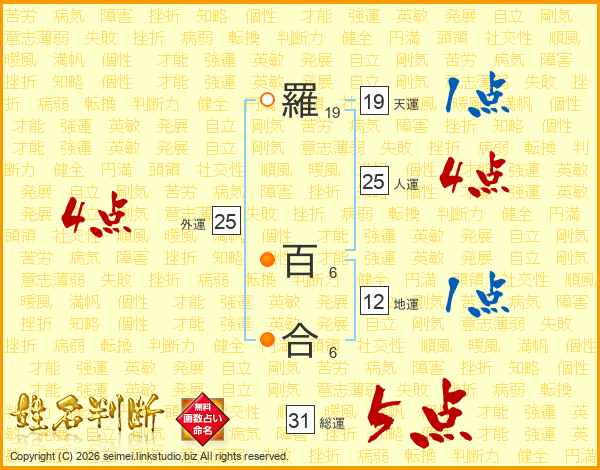 生活面を象徴する運勢です。外部から受ける影響力を表し、結婚運、家庭運や職場、環境への順応性を表します。総運から人運を引いた画数。姓や名が1文字の場合を除く。