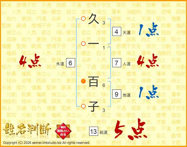 生活面を象徴する運勢です。外部から受ける影響力を表し、結婚運、家庭運や職場、環境への順応性を表します。総運から人運を引いた画数。姓や名が1文字の場合を除く。