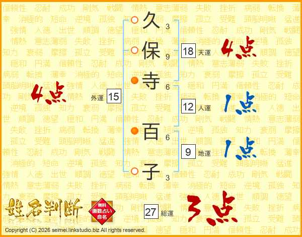 久(3画)保(9画)寺(6画) 百(6画)子(3画)