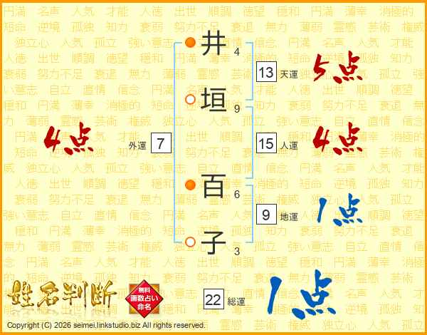 生活面を象徴する運勢です。外部から受ける影響力を表し、結婚運、家庭運や職場、環境への順応性を表します。総運から人運を引いた画数。姓や名が1文字の場合を除く。