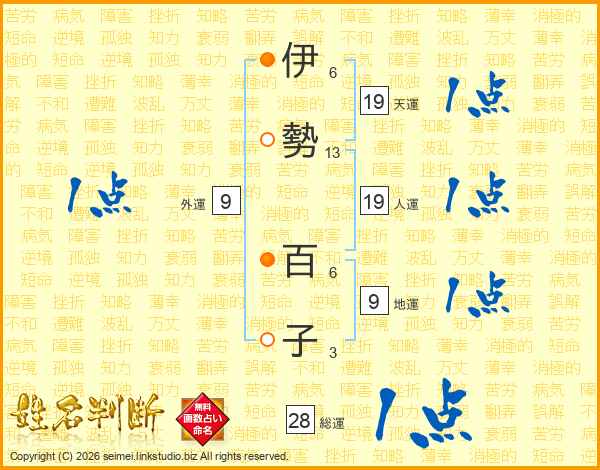 画数の奇数(○陽)と偶数(●陰)の配列で吉凶を占います。どちらかにかたよる名前は大凶名で避ける必要があります。画数の奇数偶数。