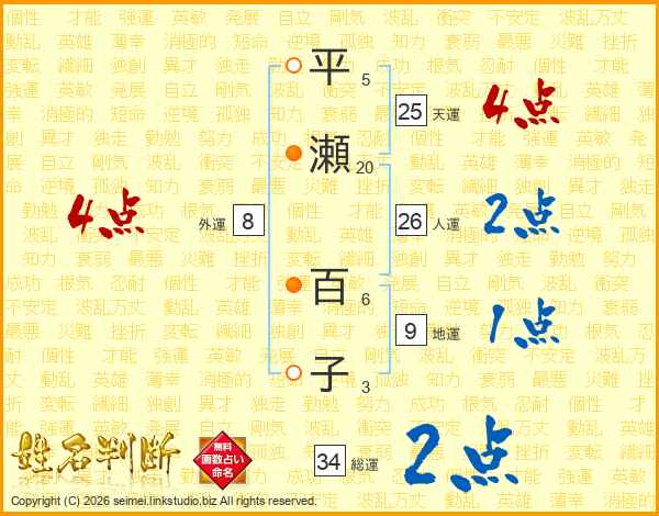 あなたの人生を表す1番重要な運勢です。生涯を通じて影響する総合運となり、主に50歳以降の晩年期に影響を及ぼします。苗字と名前の合計画数。
