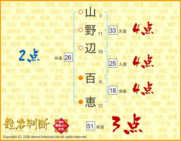 山(3画)野(11画)辺(19画) 百(6画)恵(12画)