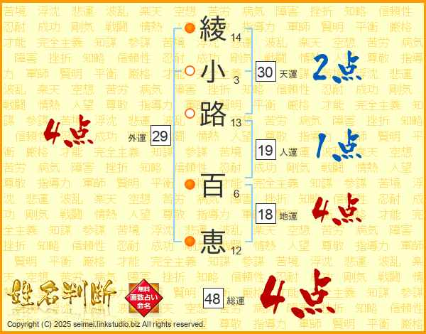 綾(14画)小(3画)路(13画) 百(6画)恵(12画)