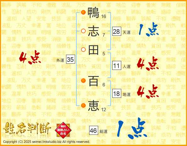 鴨(16画)志(7画)田(5画) 百(6画)恵(12画)