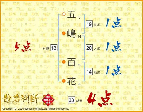 五(5画)嶋(14画) 百(6画)花(8画)