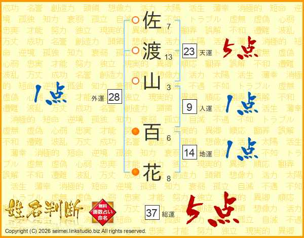 佐(7画)渡(13画)山(3画) 百(6画)花(8画)