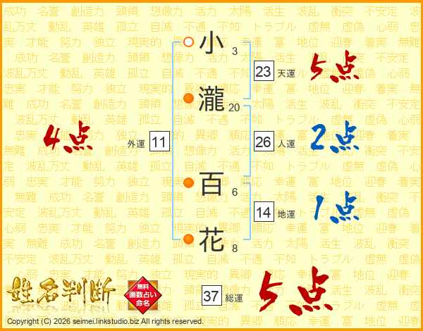 生活面を象徴する運勢です。外部から受ける影響力を表し、結婚運、家庭運や職場、環境への順応性を表します。総運から人運を引いた画数。姓や名が1文字の場合を除く。