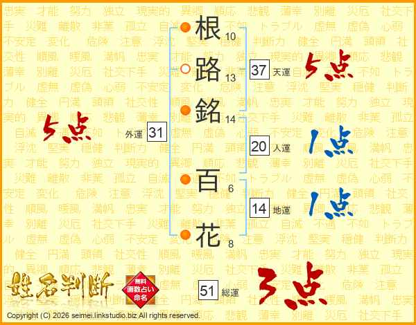 根路銘百花さんの総運は51画の3点!
