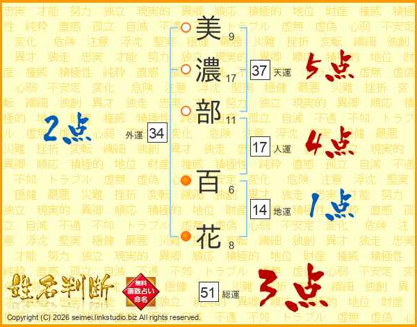 美(9画)濃(17画)部(11画) 百(6画)花(8画)