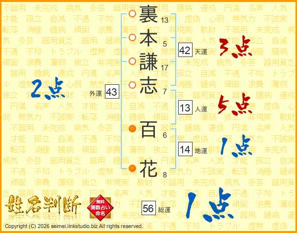 裏本謙志百花さんの人運は13画の5点!