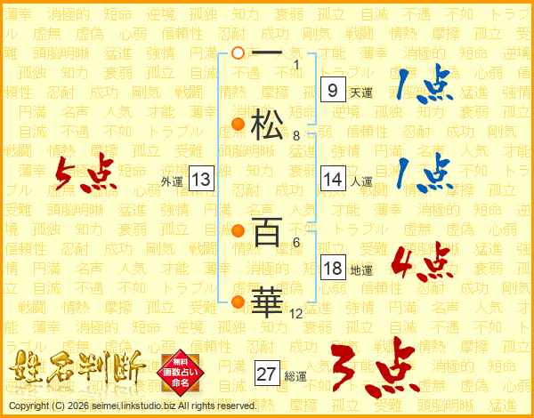あなたの人生を表す1番重要な運勢です。生涯を通じて影響する総合運となり、主に50歳以降の晩年期に影響を及ぼします。苗字と名前の合計画数。