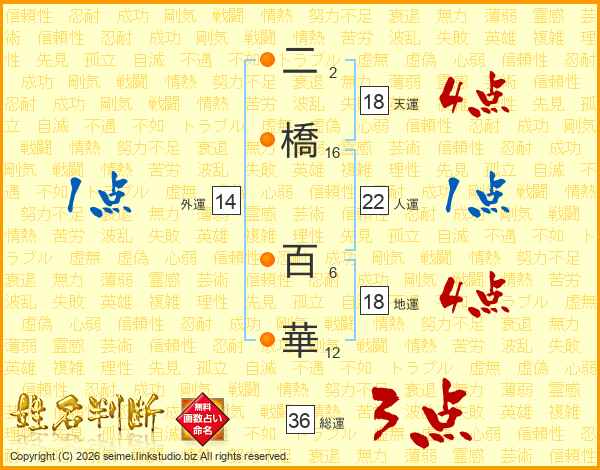 二橋百華さんの人運は22画の1点!
