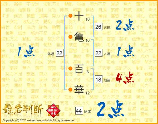 あなたの人生を表す1番重要な運勢です。生涯を通じて影響する総合運となり、主に50歳以降の晩年期に影響を及ぼします。苗字と名前の合計画数。