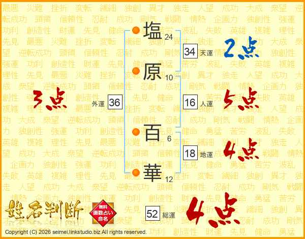 塩原百華さんの総運は52画の4点!