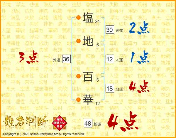 塩(24画)地(6画) 百(6画)華(12画)