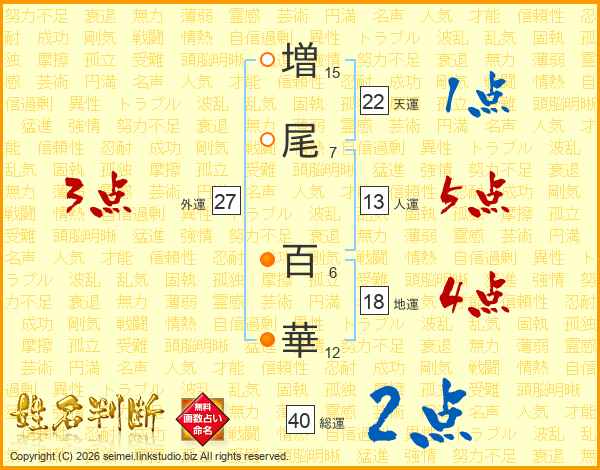 あなたの人生を表す1番重要な運勢です。生涯を通じて影響する総合運となり、主に50歳以降の晩年期に影響を及ぼします。苗字と名前の合計画数。