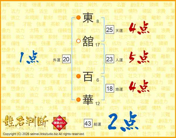 東(8画)舘(17画) 百(6画)華(12画)