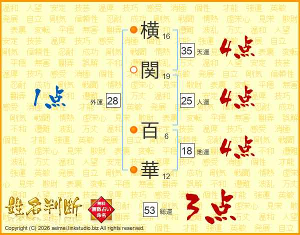 横(16画)関(19画) 百(6画)華(12画)