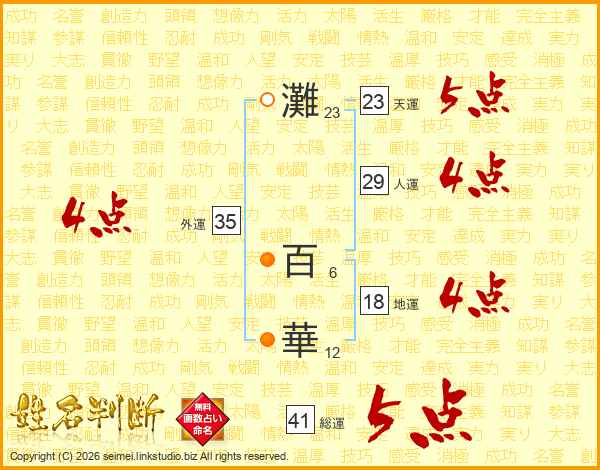 家系が持つ宿命的な運勢を表します。祖先から受け継いだ苗字ですので自分の力が及びません。家柄を象徴します。苗字の合計画数。