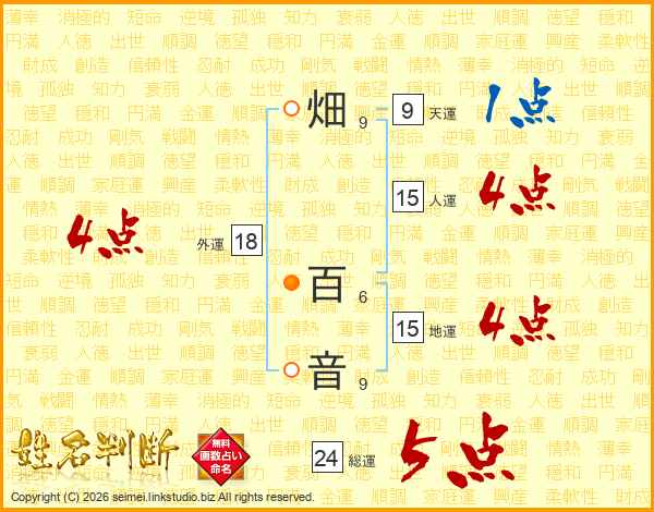生活面を象徴する運勢です。外部から受ける影響力を表し、結婚運、家庭運や職場、環境への順応性を表します。総運から人運を引いた画数。姓や名が1文字の場合を除く。