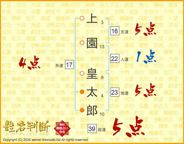 上(3画)園(13画) 皇(9画)太(4画)郎(10画)