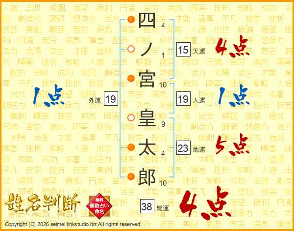 四ノ宮皇太郎さんの総運は38画の4点!