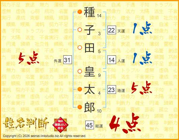 種(14画)子(3画)田(5画) 皇(9画)太(4画)郎(10画)