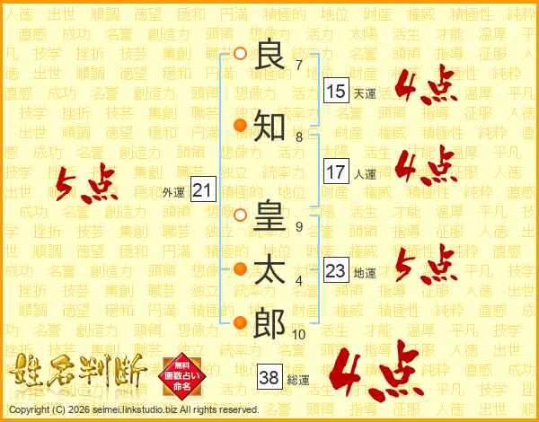 良(7画)知(8画) 皇(9画)太(4画)郎(10画)