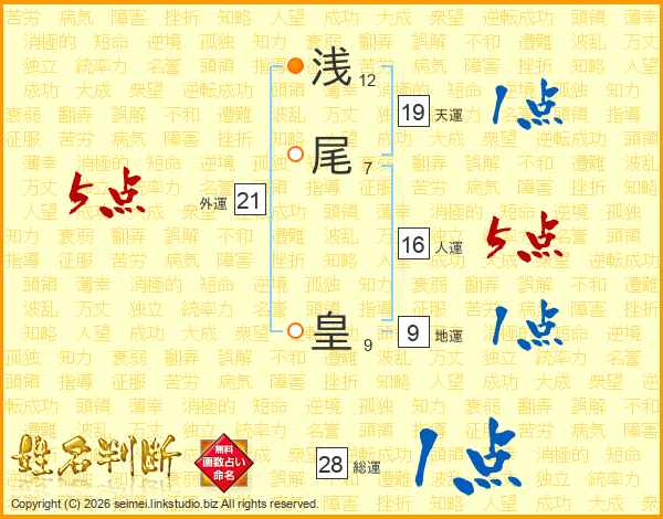 あなたの人生を表す1番重要な運勢です。生涯を通じて影響する総合運となり、主に50歳以降の晩年期に影響を及ぼします。苗字と名前の合計画数。