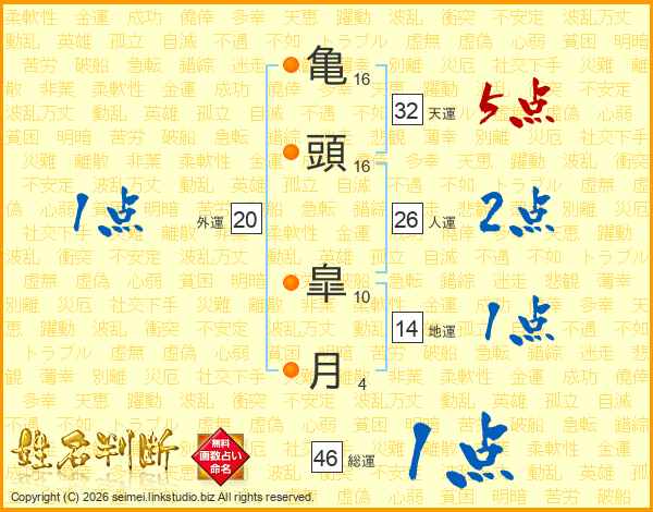 亀(16画)頭(16画) 皐(10画)月(4画)