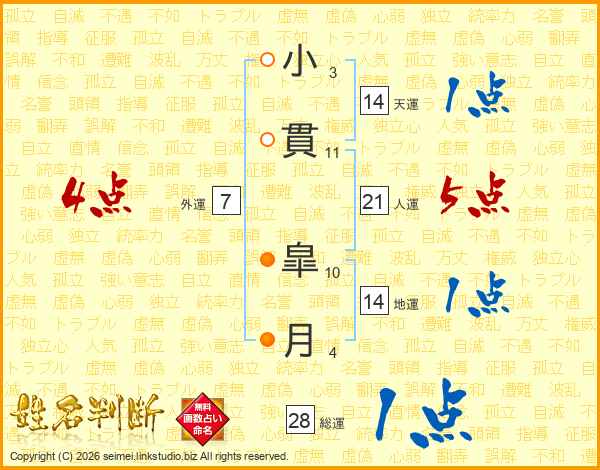 小貫皐月さんの総運は28画の1点!