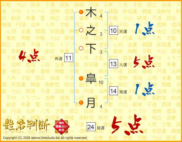 木之下皐月さんの人運は13画の5点!