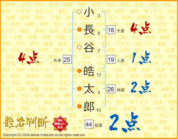小(3画)長(8画)谷(7画) 皓(12画)太(4画)郎(10画)