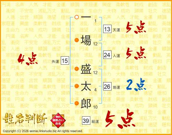 一(1画)場(12画) 盛(12画)太(4画)郎(10画)