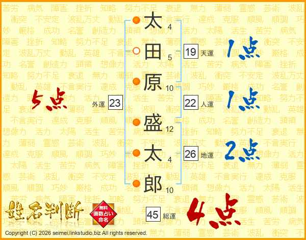 太(4画)田(5画)原(10画) 盛(12画)太(4画)郎(10画)
