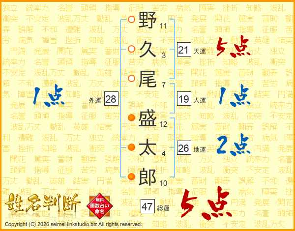 野(11画)久(3画)尾(7画) 盛(12画)太(4画)郎(10画)