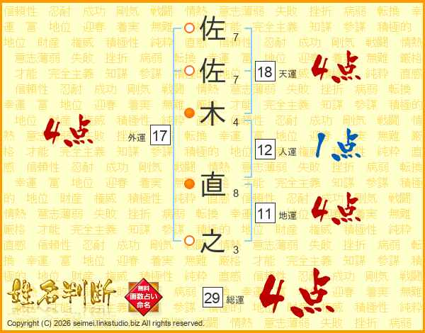 佐佐木直之さんの総運は29画の4点!
