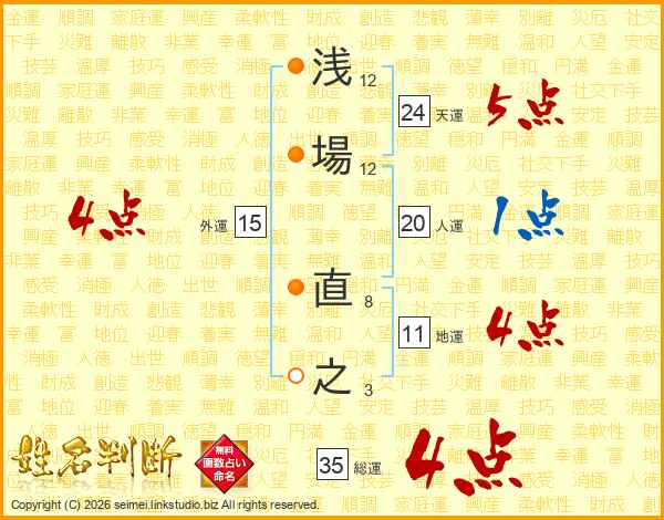 生活面を象徴する運勢です。外部から受ける影響力を表し、結婚運、家庭運や職場、環境への順応性を表します。総運から人運を引いた画数。姓や名が1文字の場合を除く。