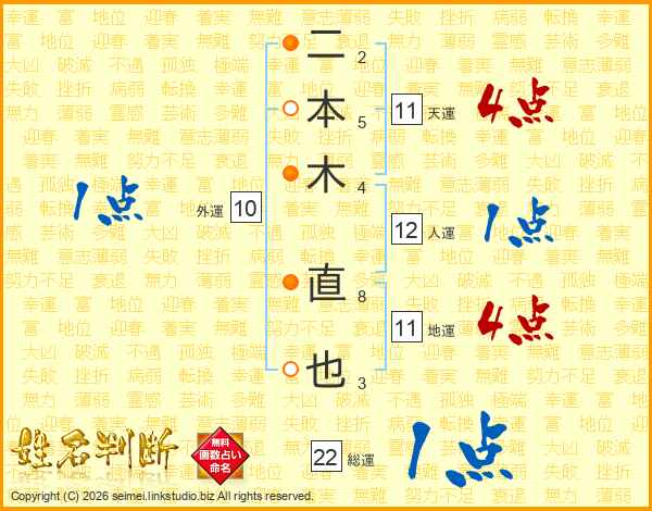 二本木直也さんの総運は22画の1点!