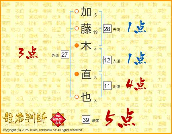 加(5画)藤(19画)木(4画) 直(8画)也(3画)