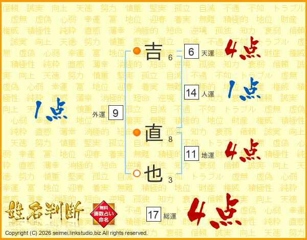 生活面を象徴する運勢です。外部から受ける影響力を表し、結婚運、家庭運や職場、環境への順応性を表します。総運から人運を引いた画数。姓や名が1文字の場合を除く。