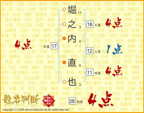 堀(11画)之(3画)内(4画) 直(8画)也(3画)