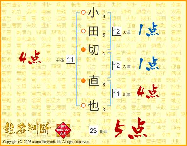 小(3画)田(5画)切(4画) 直(8画)也(3画)