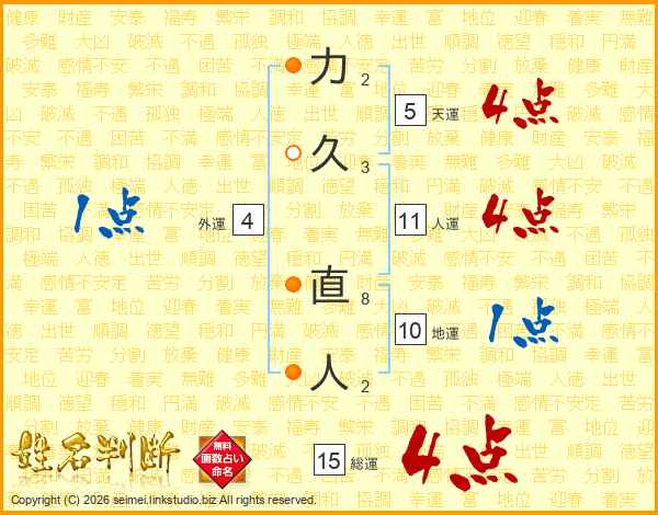 あなたの人生を表す1番重要な運勢です。生涯を通じて影響する総合運となり、主に50歳以降の晩年期に影響を及ぼします。苗字と名前の合計画数。