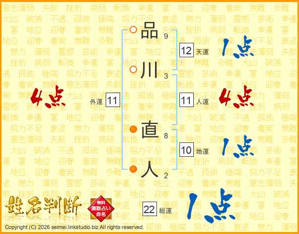 品川直人さんの総運は22画の1点!