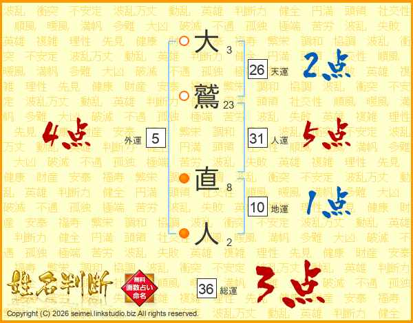 あなたの人生を表す1番重要な運勢です。生涯を通じて影響する総合運となり、主に50歳以降の晩年期に影響を及ぼします。苗字と名前の合計画数。