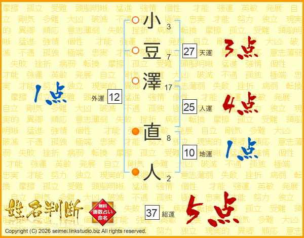 小(3画)豆(7画)澤(17画) 直(8画)人(2画)