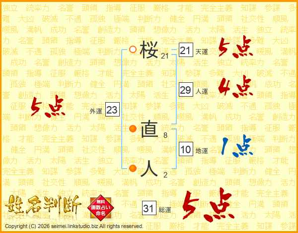 あなたの人生を表す1番重要な運勢です。生涯を通じて影響する総合運となり、主に50歳以降の晩年期に影響を及ぼします。苗字と名前の合計画数。